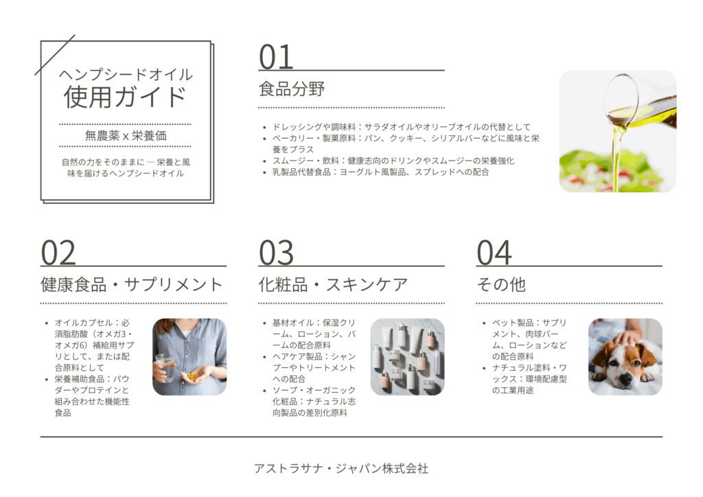 さらに、ヘンプシードオイルならではの香ばしいナッツの風味が特徴で、サラダやスムージー、ベーカリーやプロテインバーなど、幅広い食品や健康食品にご利用いただけます。オーガニック志向の製品開発や、機能性食品の差別化原料としても最適です。