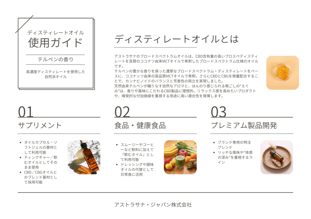 本ディスティレートオイルは、サプリメント・ティンクチャー・スキンケア化粧品など、香りや風味を大切にした製品設計に最適なプレミアム原料です。