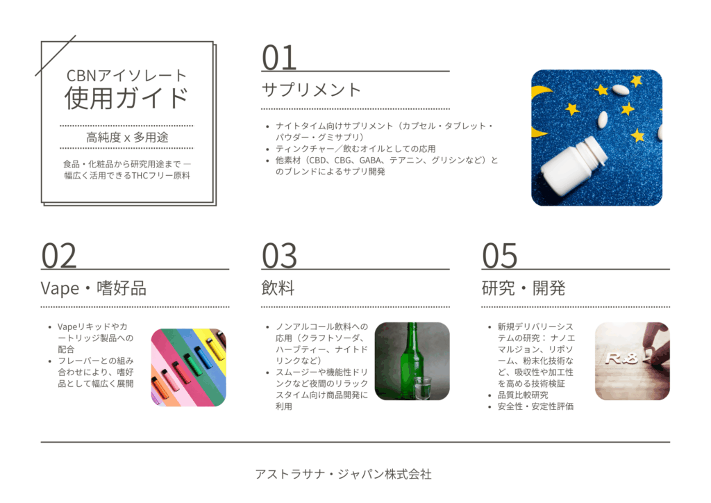 近年では、CBN特有の機能性に注目が集まり、CBDやCBGに続く第3のカンナビノイドとして、研究および製品開発が進んでいます。特に、夜間のリラックスやウェルビーイングサポートを目的とした製品への応用が期待されており、食品や化粧品原料としての用途探索が活発です。