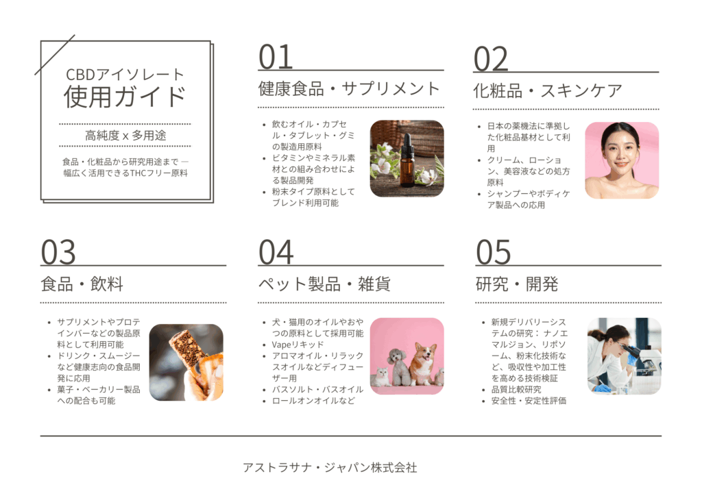 当社のCBDアイソレートは、ウェルネスやウェルビーイングに特化したサプリメントや、次世代型のコスメ・スキンケア製品など、健康と美容の新たなトレンドを視野に入れた製品開発に最適な原料です。